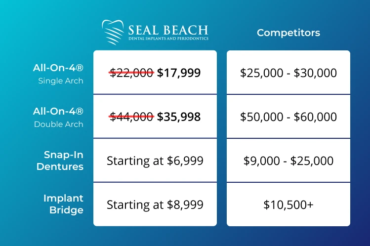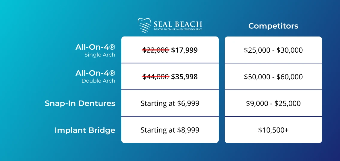 At Seal Beach Dental Implants and Periodontics, you can rest assured that you’re getting the absolute best price for your dental implant treatment without sacrificing quality. This is due to our state-of-the-art technology and in-house lab, which allow us to complete your entire procedure and teeth fabrication under one roof. Not only does this lead to fewer visits, quicker turnaround times, and a more precise final result, but also lets us pass our savings onto you!
